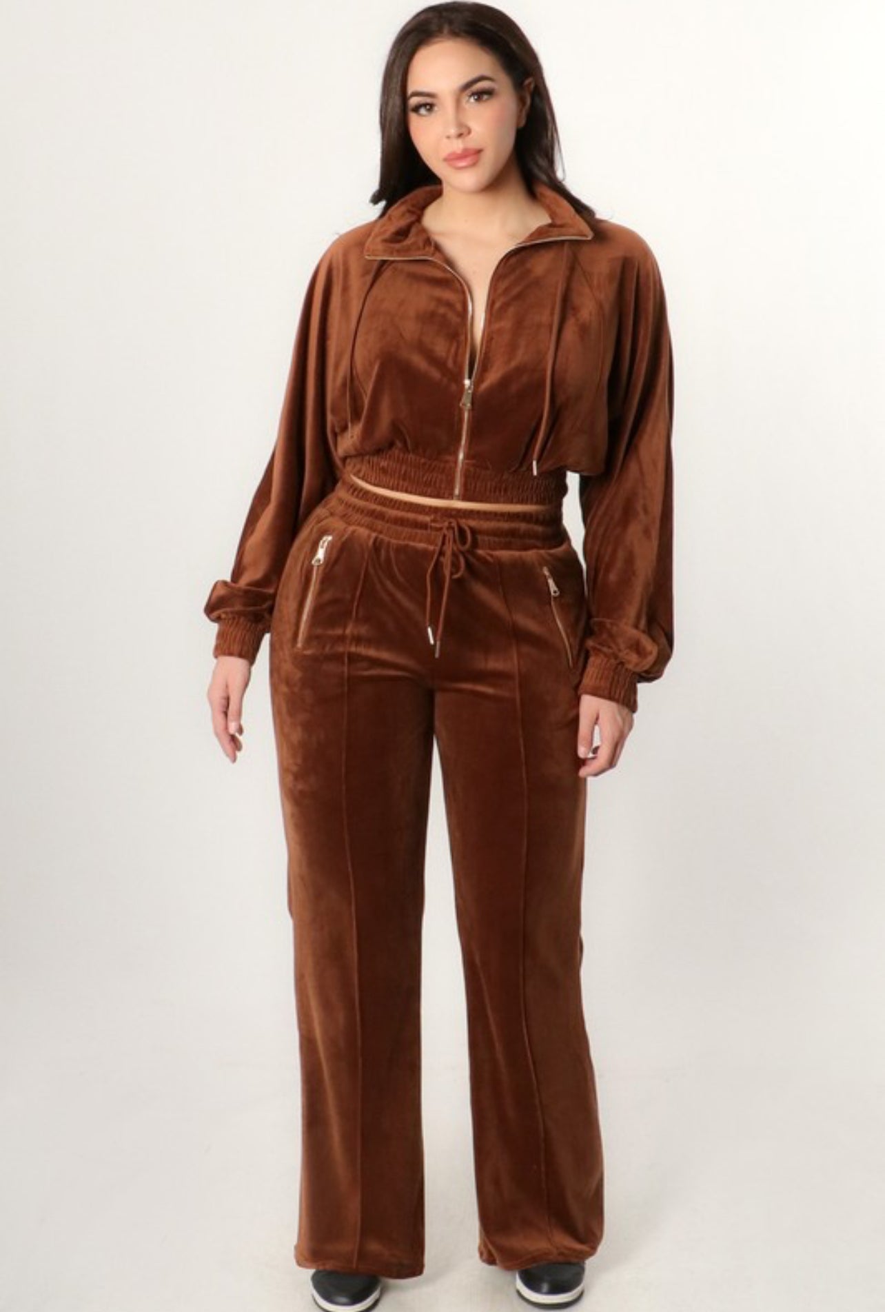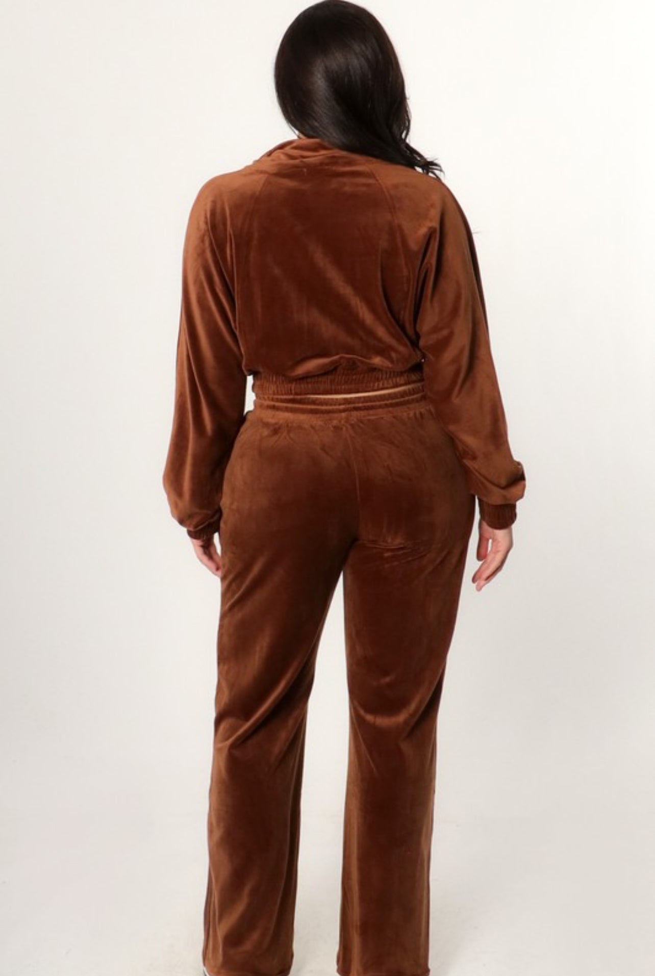 Brown Velvet Jacket and Pants Set. Elastic Waist and high waisted pant with drawstrings. Perfect for chilly days!